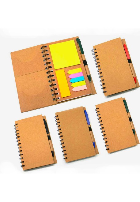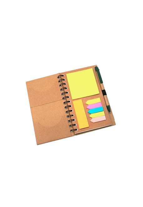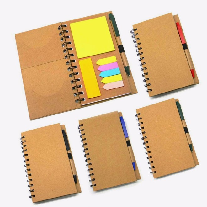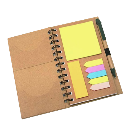 Bloco de anotações ecológico com post-its e caneta reciclável.