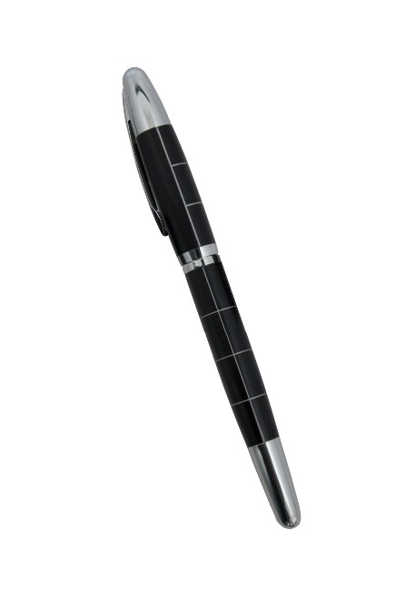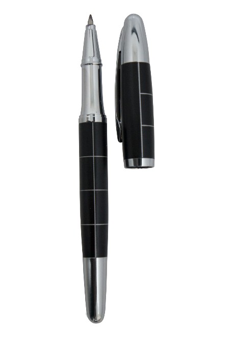 Caneta roller, com detalhes xadrez e área de gravação específica. Escrita na cor: Preto Tamanho total do produto: (CxC) 14,0cm X 4,5cm Peso total do produto: 25g