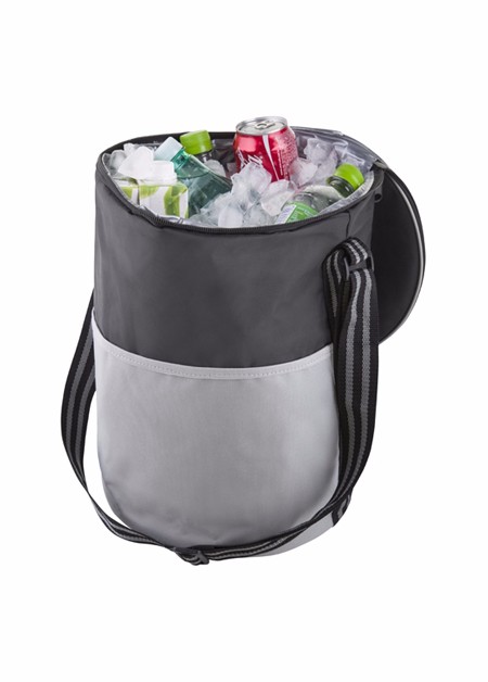 Tecido nylon e poliéster, capacidade para 25 Litros, bolsa frontal, Alça de ombro regulável. Cor preta, com bolso cinza. Tamanho total do produto: 27 cm x 37 cm x 27 cm