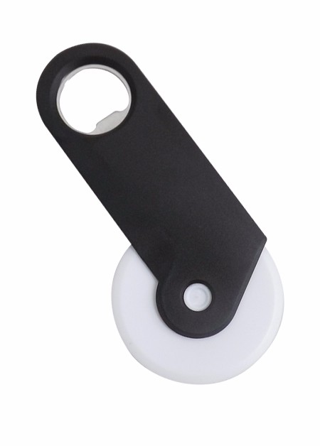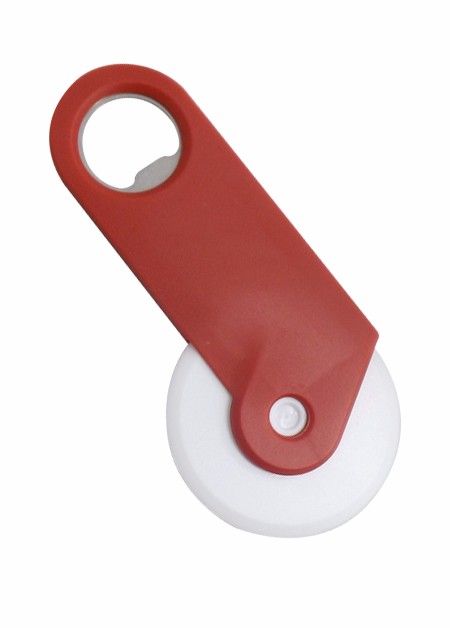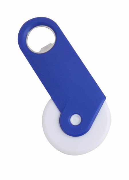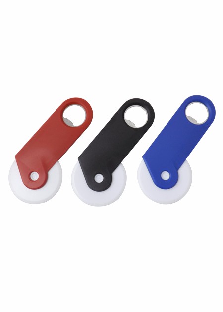 Abridor de Garrafa e Cortador de Pizza de plástico em três cores Vermelho, Azul e Preto. Área de Gravação (LxA): 5,5 cm x 2,0 cm Medida Total (LxA): 12,5 cm x 6,1 cm Peso total: 29g