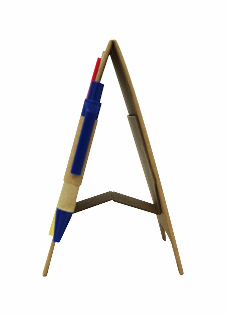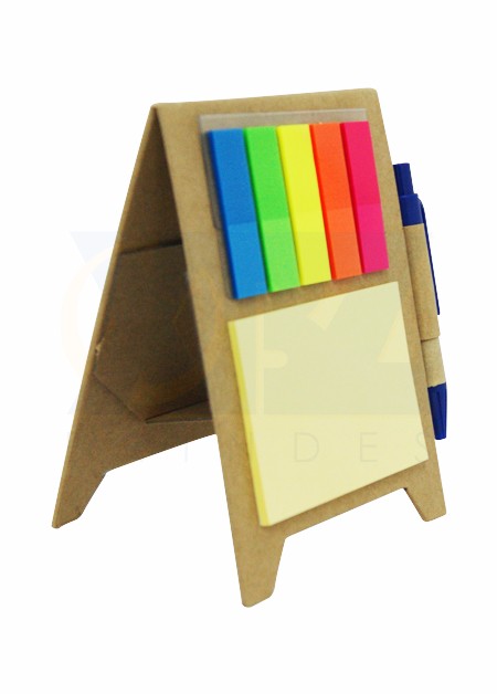 Bloco de anotação com post-it (50 folhas amarelas), marcadores coloridos (25 folhas) e caneta, material reciclado.