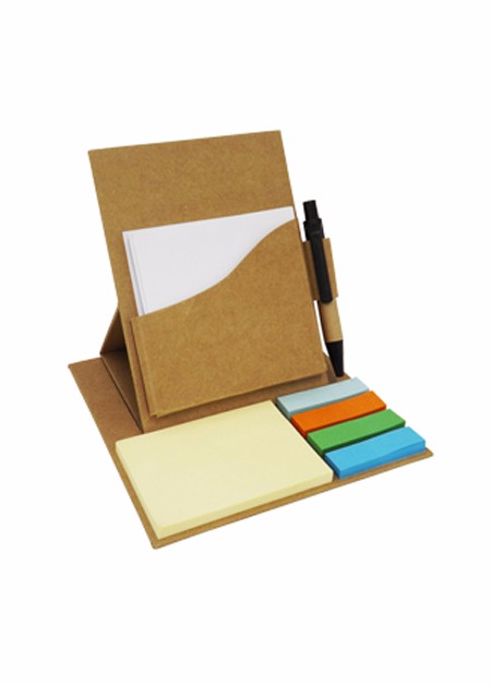 Bloco de anotação com post-it (50 folhas amarelas), marcadores coloridos (25 folhas) e caneta, material reciclado.