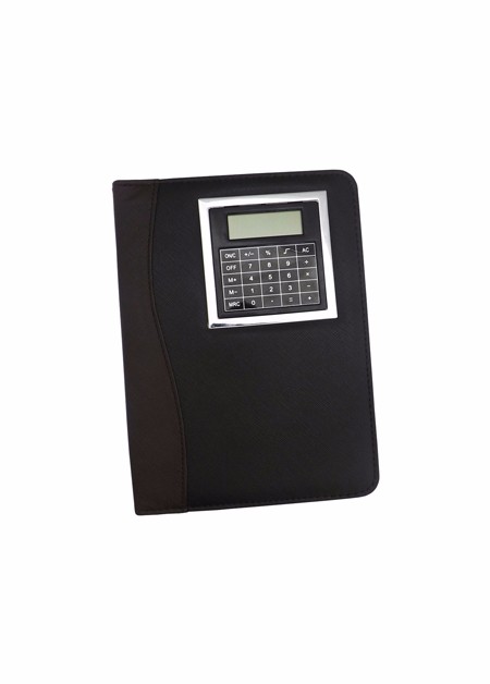 Bloco de anotações com calculadora e caneta, capa do bloco de couro sintético. Medidas total (C x L): 24 x 18cm Peso Total: 305 Gramas