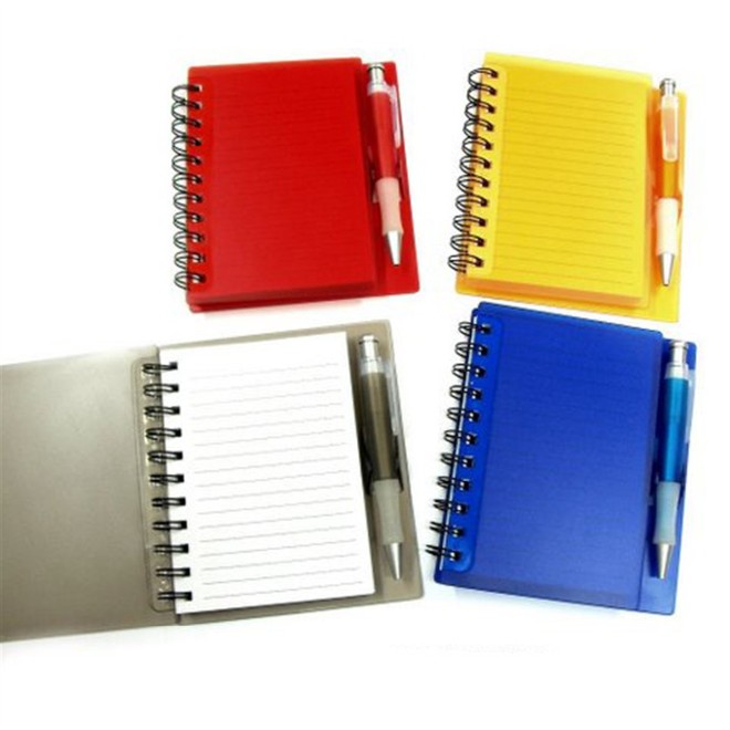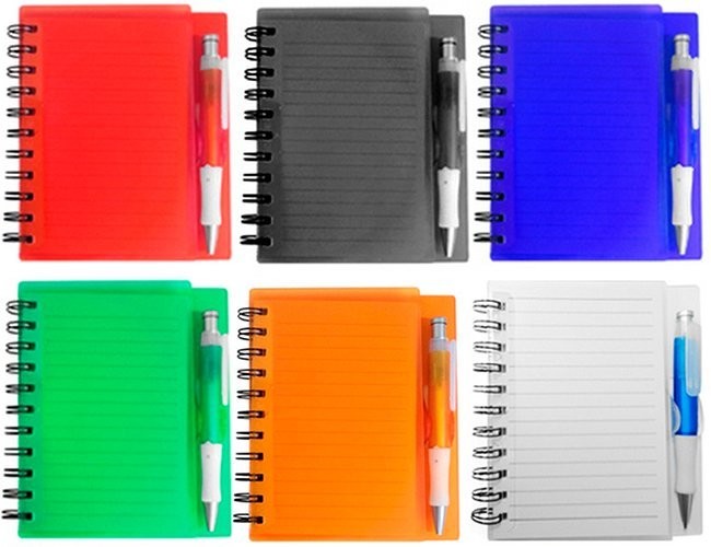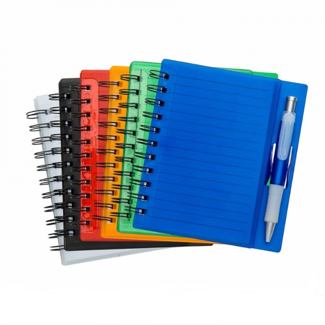 Bloco de anotações com capa de plástico resistente e caneta esferográfica.