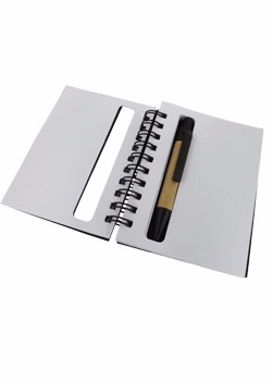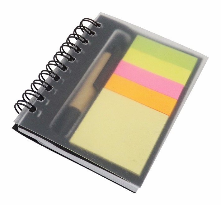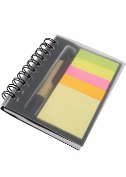 Bloco de anotações com post-it e mini caneta (reciclável), capa transparente.