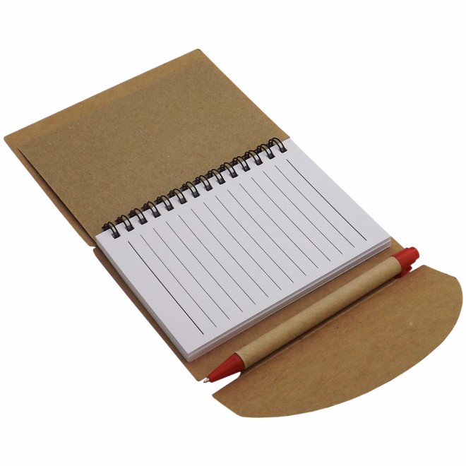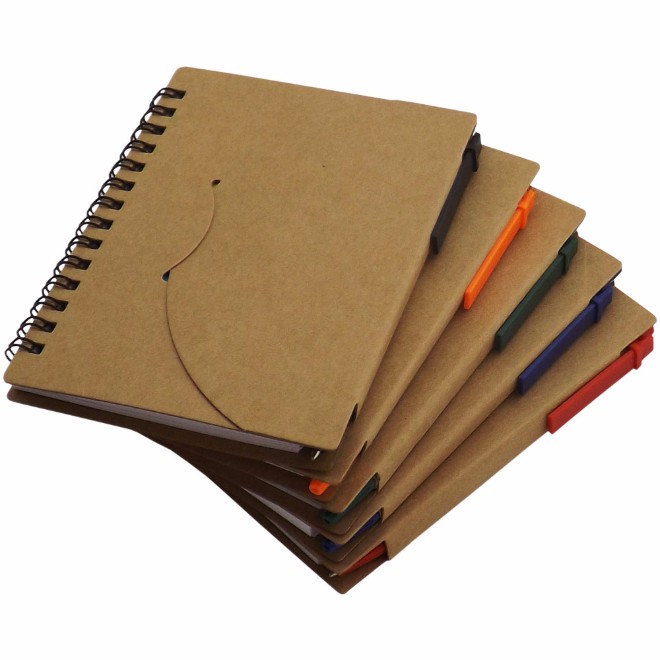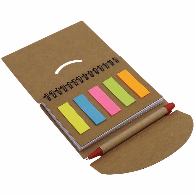 Bloco de anotações ecológico, com post-it, em diversas cores. Caneta de material reciclável e carga azul.