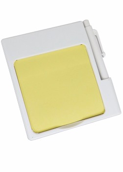 Bloco de Anotações na cor branca, com post-it (aproximadamente 25 folhas amarelas) e caneta (carga preta). Material de plástico resistente.