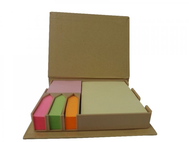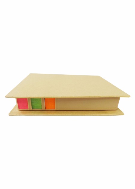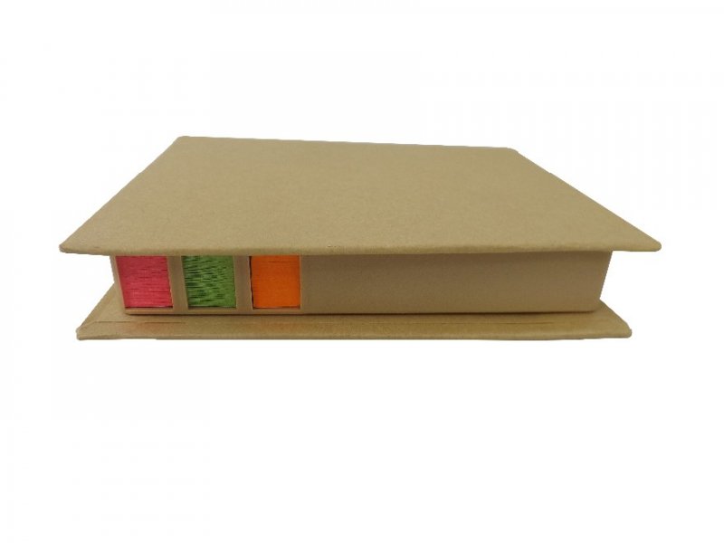 Bloquinhos de anotações ecológico com régua plástica de 12 cm, post-its coloridos e caneta reciclável.