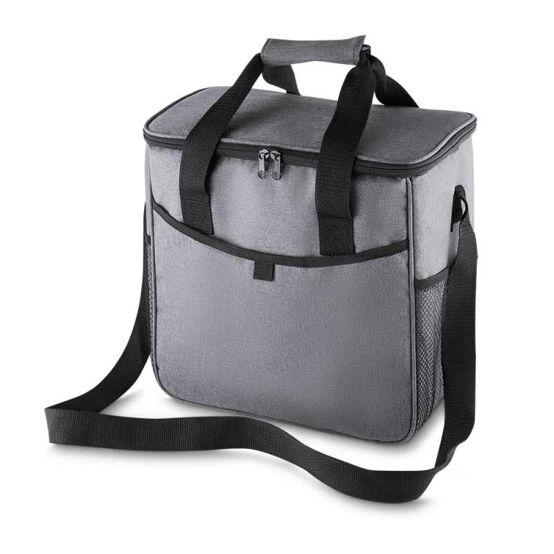 BOLSA TÉRMICA Bolsa térmica, capacidade 16 litros, tecido nylon e poliéster, bolso frontal, alça de ombro regulável, parte interna soldada = retém liquido, gravação bolso frontal ou tampa.