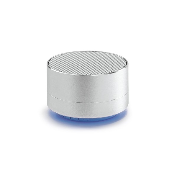 Caixa de som com microfone. Alumínio. Com transmissão por bluetooth e leitor de cartões TF. Com 3W/4Ω. Autonomia até 5 h. Função para atender chamadas, controle de volume, conexão à playlist do dispositivo móvel e rádio FM. Incluso cabo micro USB para carregar. Fornecida em caixa presente. ø71 x 42 mm | Caixa: 80 x 80 x 60 mm