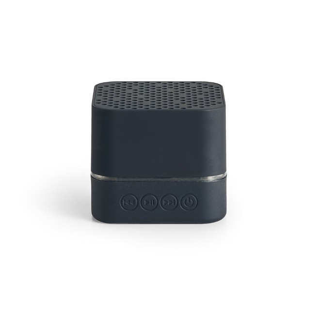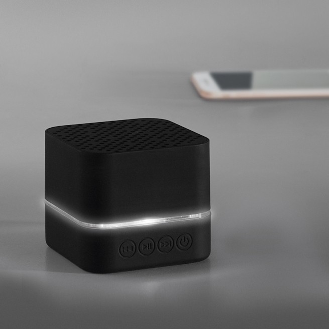 Caixa de som. ABS. Acabamento emborrachado. Luz LED no seu interior. Transmissão por bluetooth. Personalizável com logotipo iluminado. Autonomia: > 2h. Bateria: 300mAh. Inclui cabo USB - micro USB para carregamento. Fornecida em caixa. 59 x 59 x 51 mm