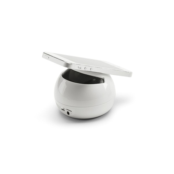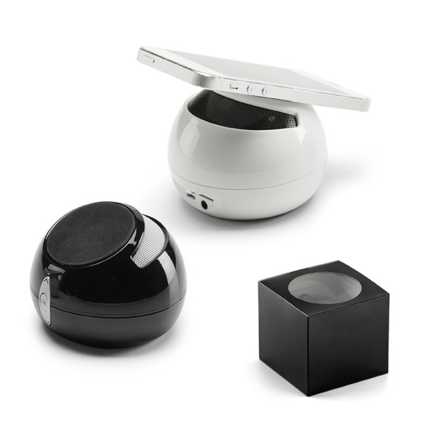 Caixa de som com microfone. ABS. Com transmissão por bluetooth, ligação stereo 3,5 mm e leitor de cartões TF. Com 3W/4Ω. Autonomia até 3 h. Função para atender chamadas, controle de volume e conexão à playlist do dispositivo móvel. Com apoio antideslizante para celular. Incluso cabo USB para carregar. Fornecida em caixa presente. ø85 x 66 mm | Caixa: 93 x 93 x 85 mm
