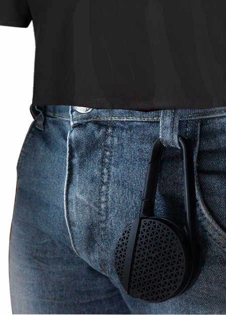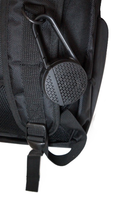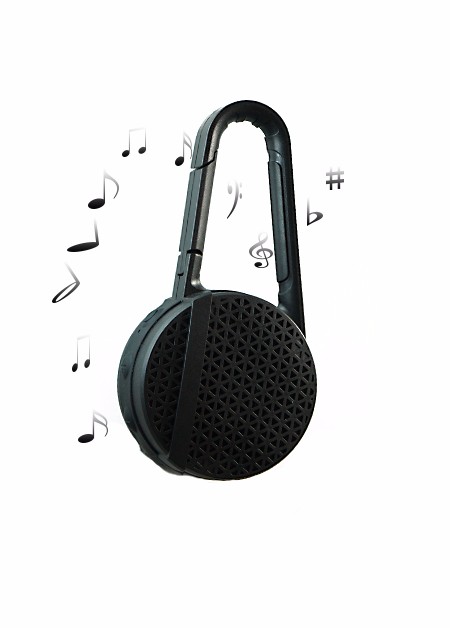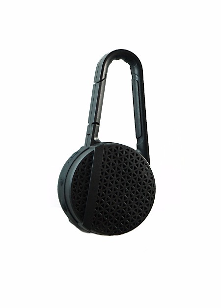 Caixa de som com mosquetão, para ser conectado via bluetooth.