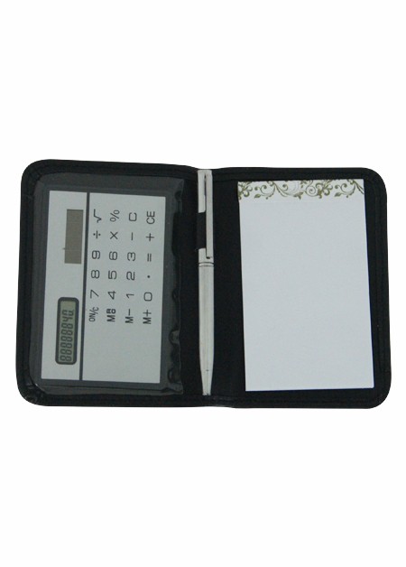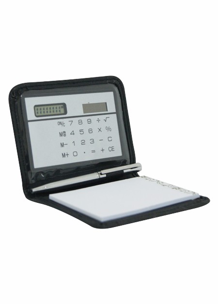 Calculadora com bloco de anotações removível e caneta. Capinha de couro sintético. Bloco de anotações com aproximadamente 30 páginas. Tamanho total (CxL): 7,8 cm x 10,5 cm Peso do produto: 54 g