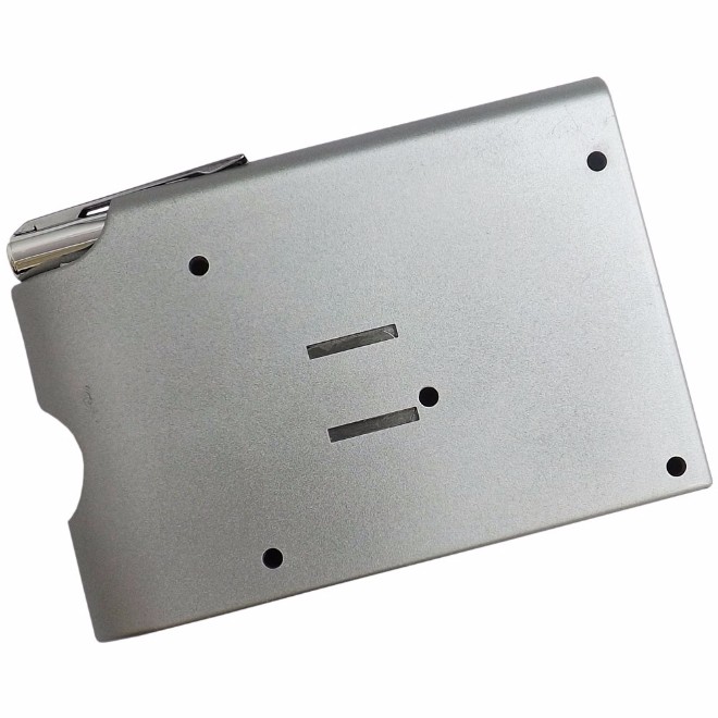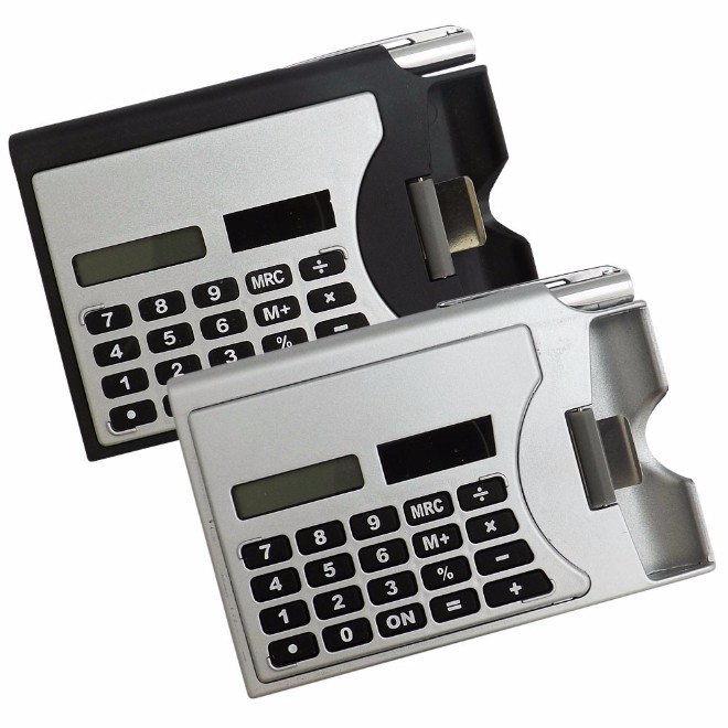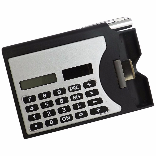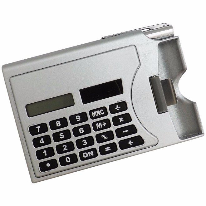 Calculadora com caneta e porta cartão, de plástico com detalhes na cor prata.