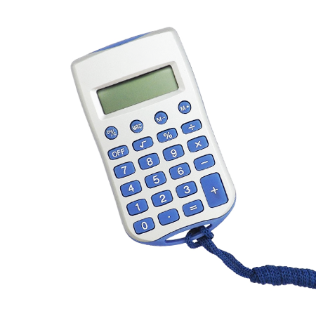 Calculadora de plástico com cordão. Calculadora de 8 dígitos (Na visor podemos ver 8 dígitos). Medidas para gravação (CxL): 1,4 cm x 4,8 cm Tamanho total (CxL): 10,3 cm x 5,5 cm Peso do produto: 33 g