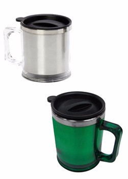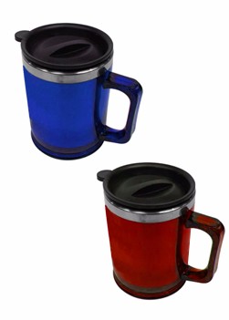 Caneca de acrílico translúcida com tampa, capacidade para 400 ml, cores: azul, vermelho, transparente, verde.
