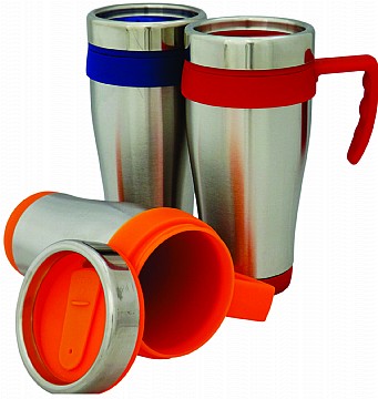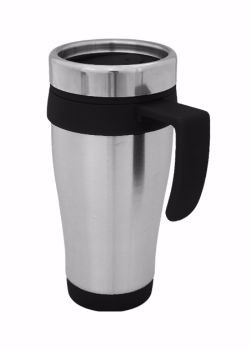 Caneca de inox com capacidade para 400 ml, com tampa. Medida total (CxC): 17 x 31 cm Peso total: 176