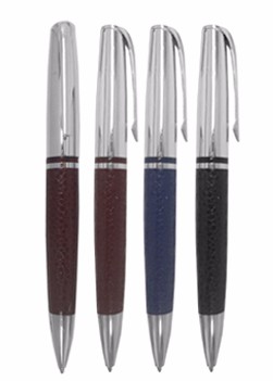 Caneta de metal brilhante, com detalhe em couro sintético. Tamanho total (CxD): 13,2 cm x 14,1 cm Peso do produto: 24 g