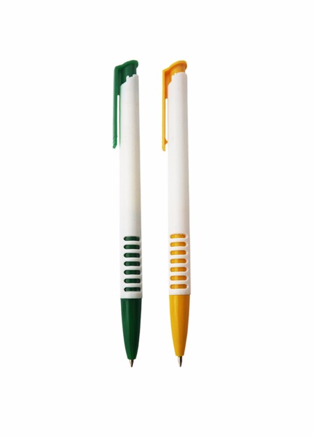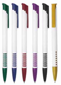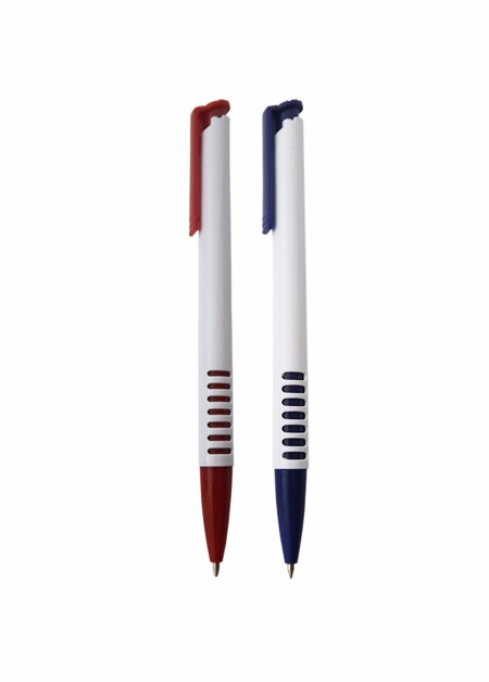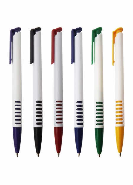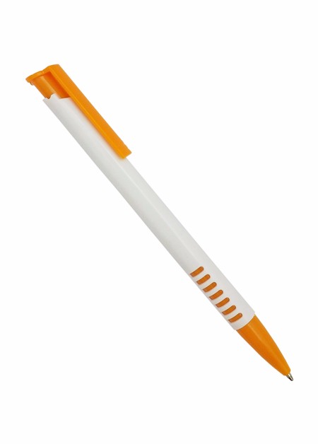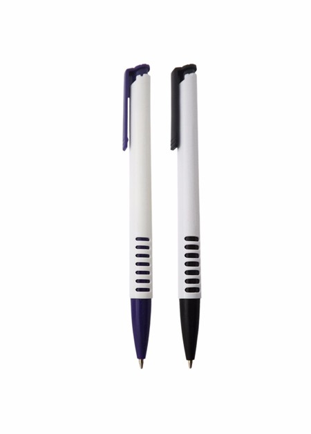 Caneta de plástico com corpo branco. Medidas para gravação (CxD): 7,5 cm x 3,5 cm Tamanho total (CxD): 13,8 cm x 3,5 cm Peso do produto: 7 g