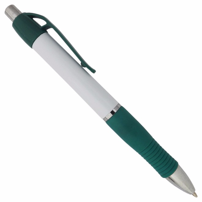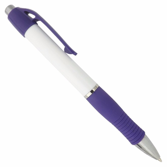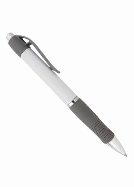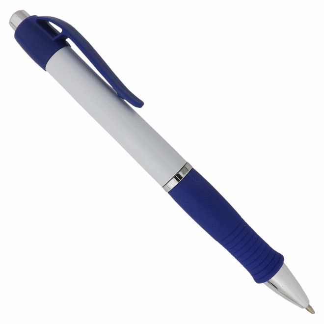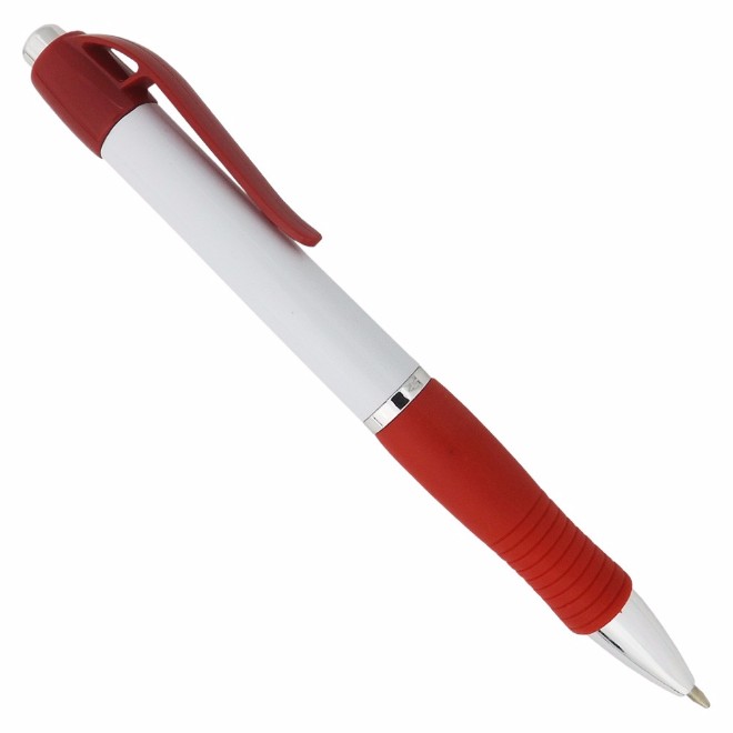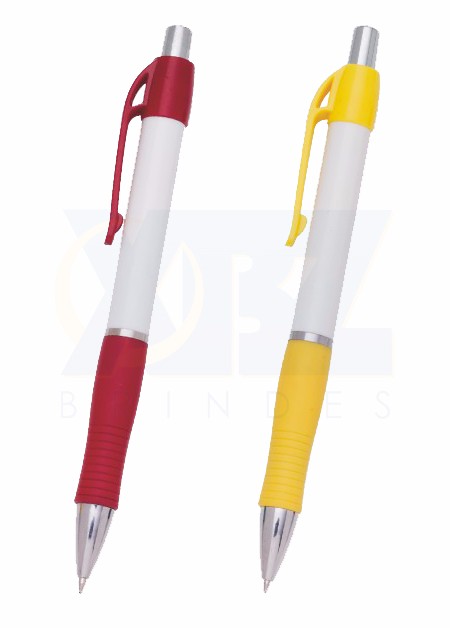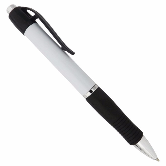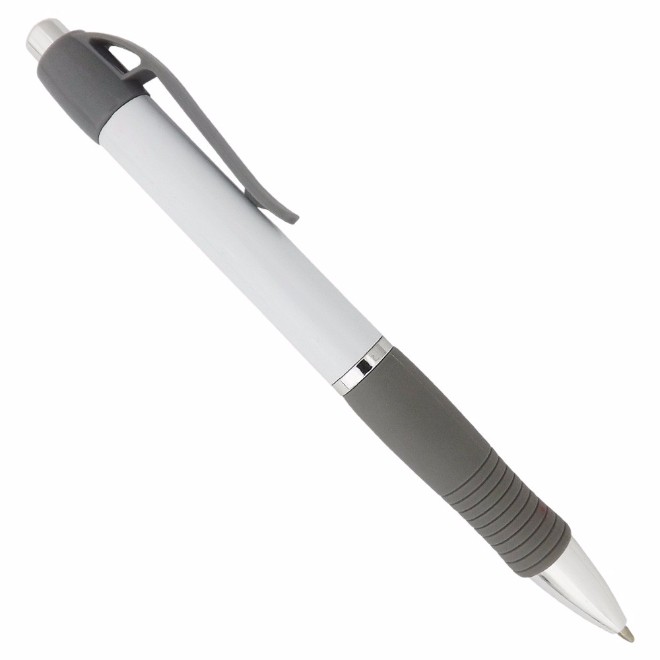 Caneta de plástico com detalhe emborrachado. Tamanho total (CxD): 13,5 cm x 3,6 cm Peso do produto: 11 g