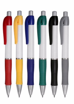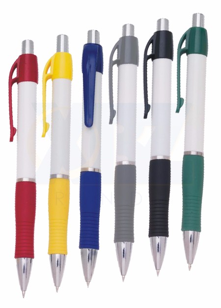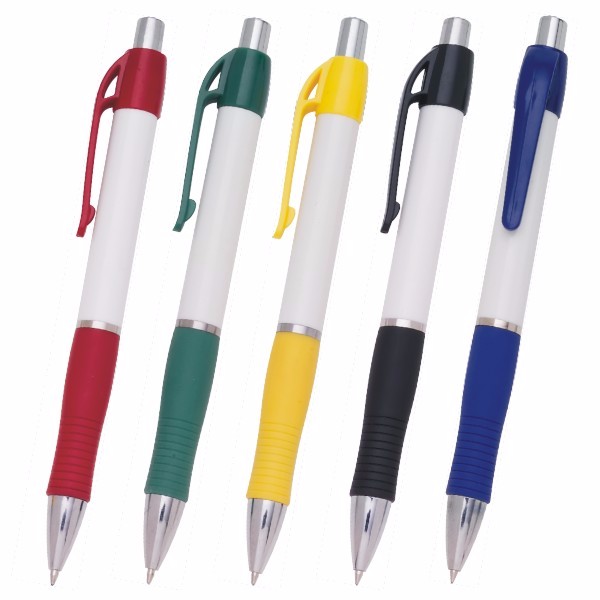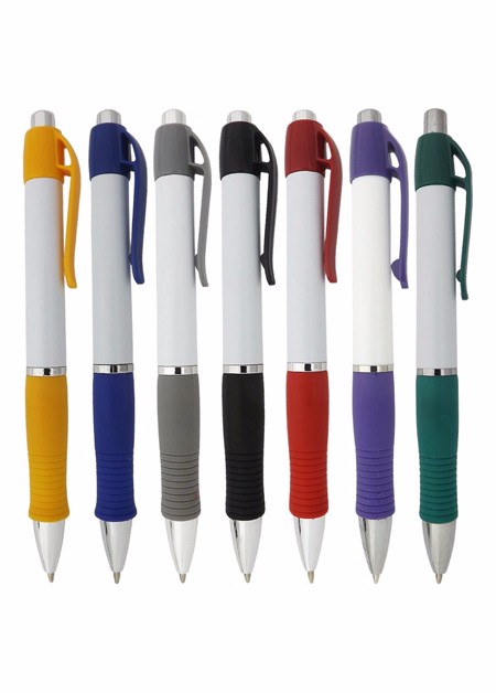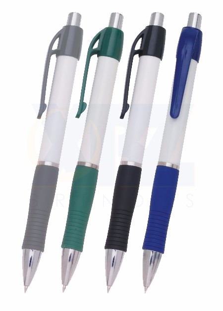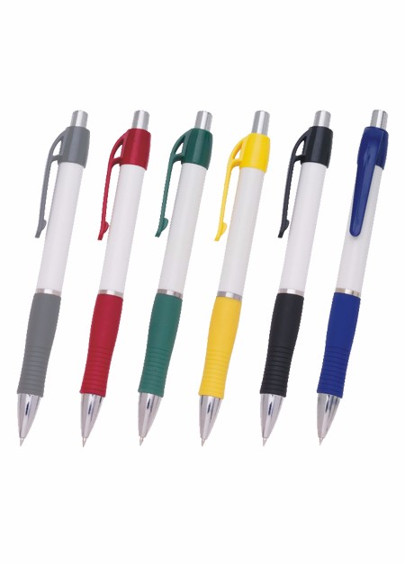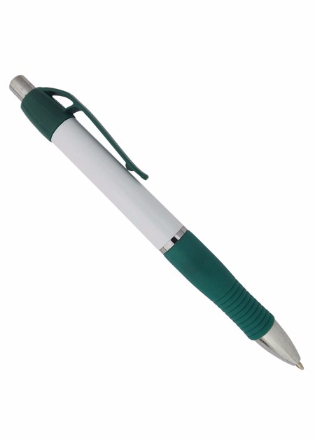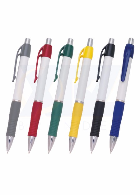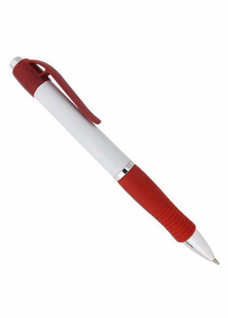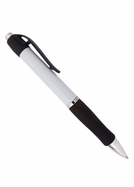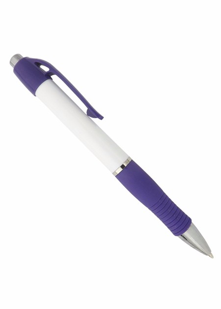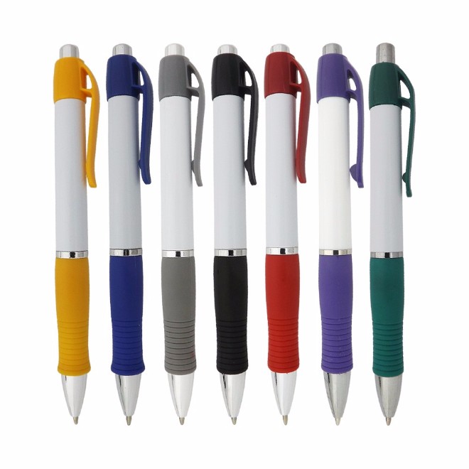 Caneta de plástico com detalhe emborrachado. Tamanho total (CxD): 13,5 cm x 3,6 cm Peso do produto: 11 g