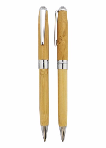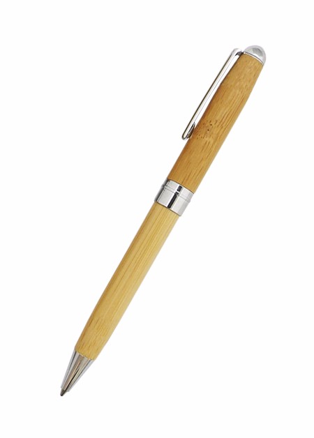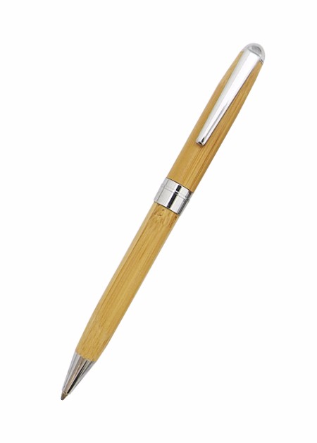 Caneta ecológica de bambu com detalhes de metal. Tamanho total (CxD): 13,9 cm x 3,3 cm Peso do produto: 16 g