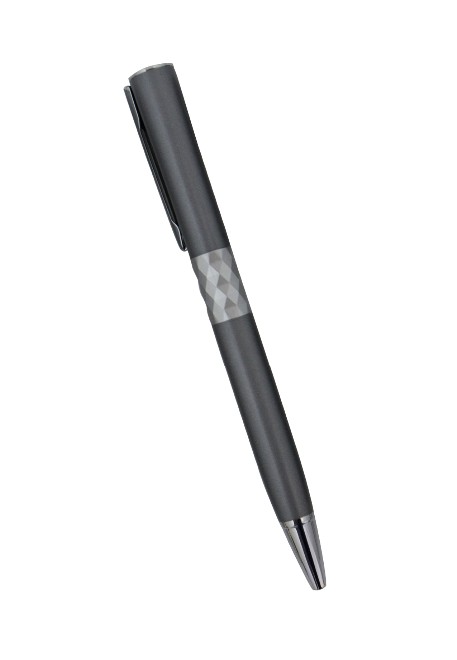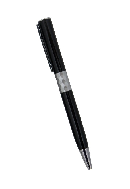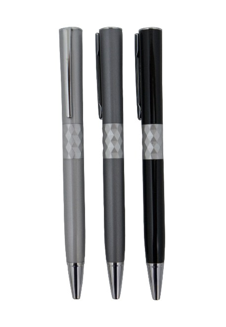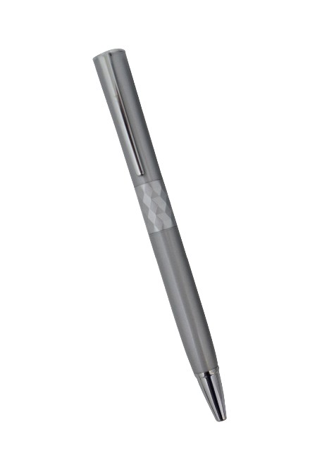 Caneta esferográfica de metal, com detalhes pratas. Tamanho total do produto: (CxC) 14,0cm X 4,0cm Peso total do produto: 30g