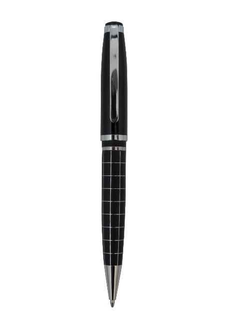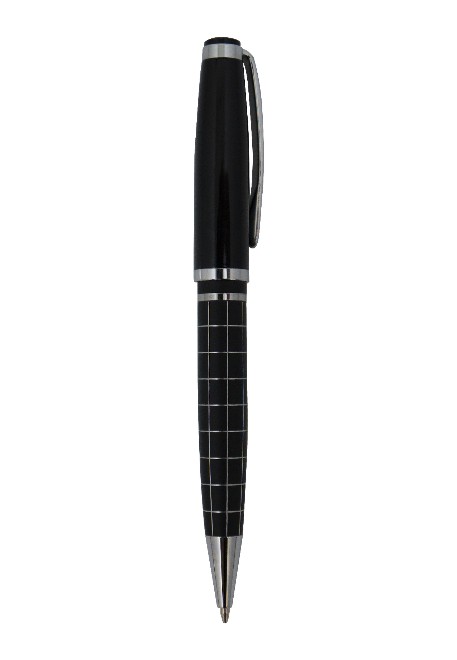 Caneta esferográfica de metal, detalhada em forma de xadrez. Tamanho total do produto: (CxC) 14,0cm X 5,0cm Peso total do produto: 30g