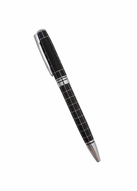 Caneta metal Xadrez, com detalhe prata e espaço para gravação. Carga Azul. Tamanho total do produto: (CxL) 13,9cm X 4,0cm Peso total do produto: 19g
