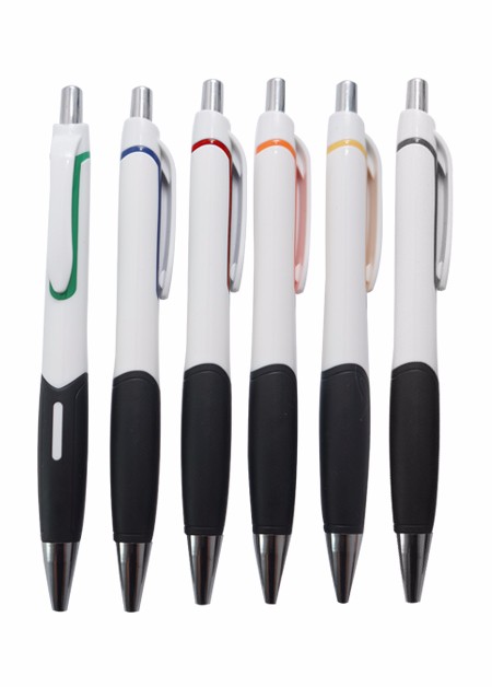 Caneta plástica com corpo branco e detalhes coloridos. Tamanho total do produto: (CxC) 14,0cm X 4,0cm Peso total do produto: 9g