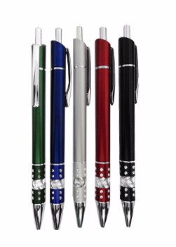 Caneta plástica, com corpo prata, detalhes brilhantes. Medidas para gravação (CxC): 6,1 cm x 2,6 cm Tamanho total (CxC): 14,0 cm x 3,3 cm Peso do produto: 9 g