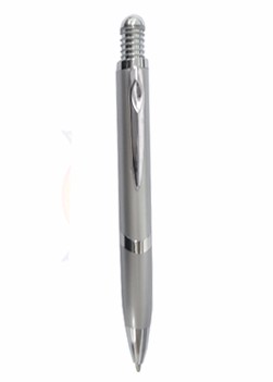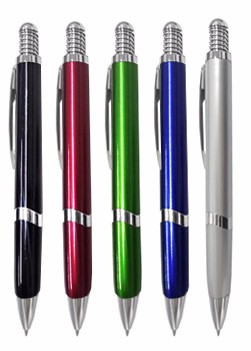 Caneta plástica, com detalhe de 1 anel. Tamanho total (CxC): 14 cm x 4,2 cm Peso do produto: 13 g