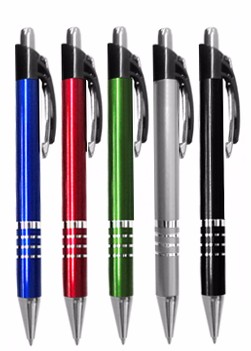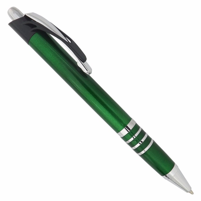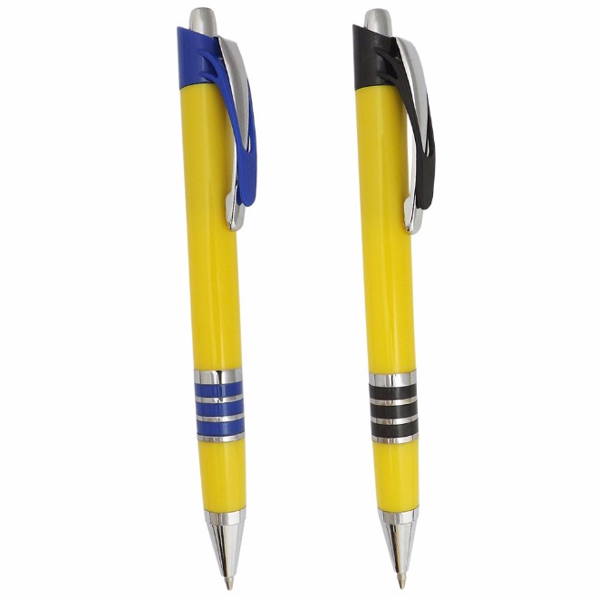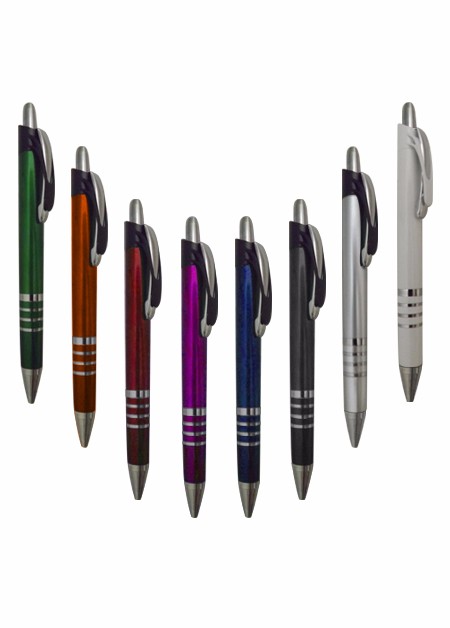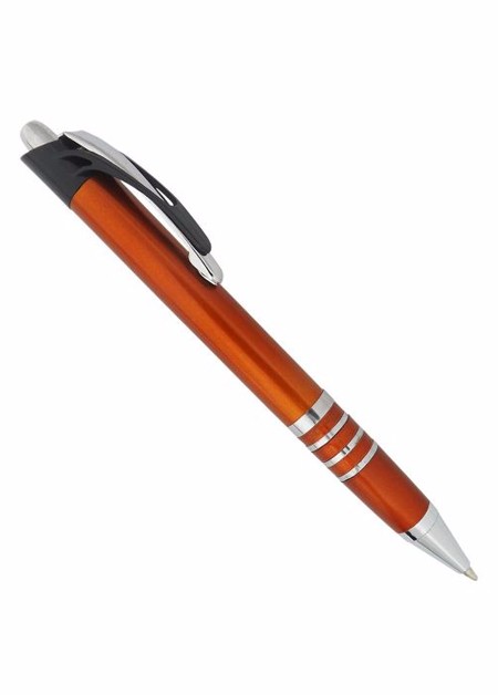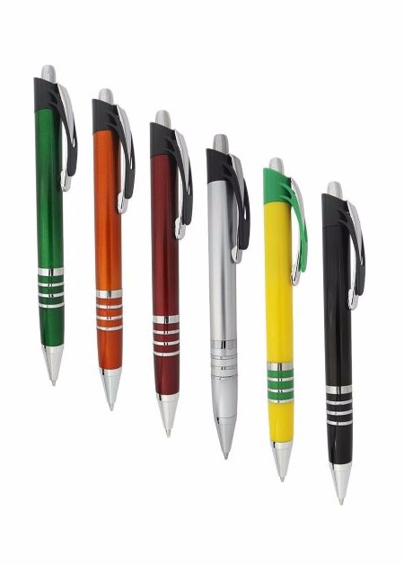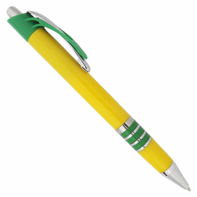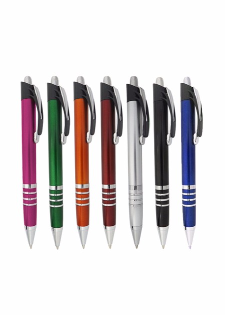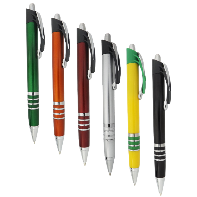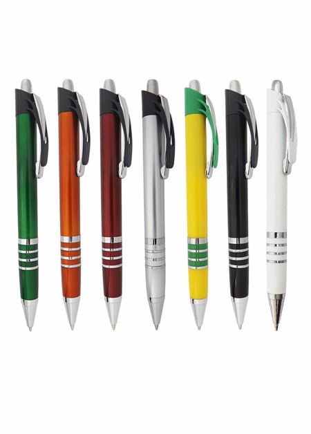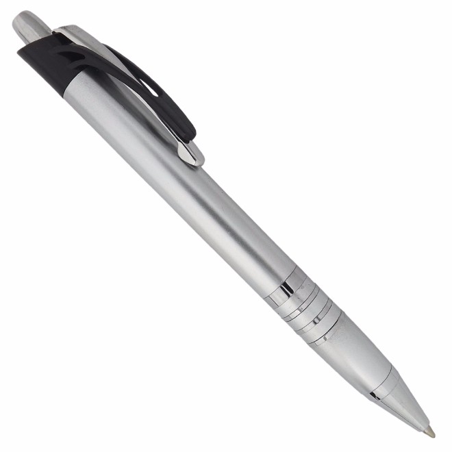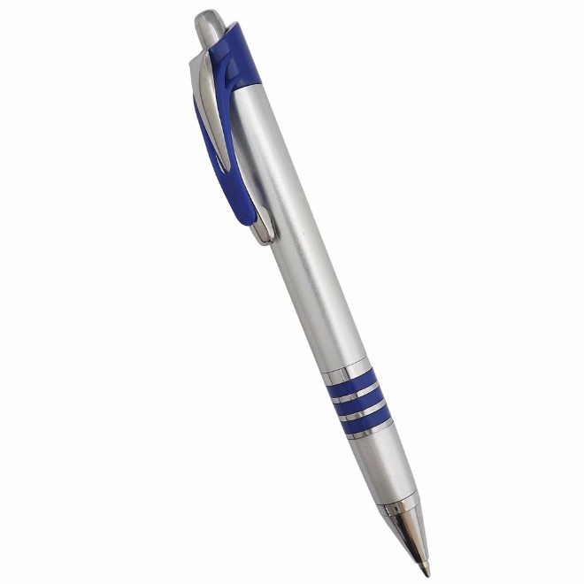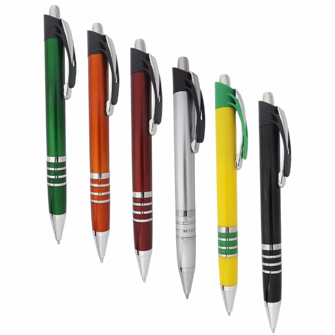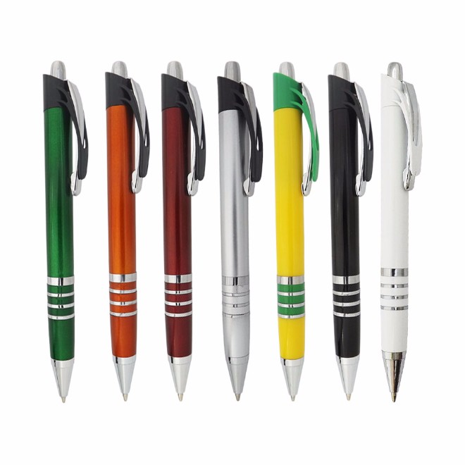Caneta plástica com detalhe de quatro aneis branca Medidas para gravação (CxD): 6,8 cm x 4,0 cm Tamanho total (CxD): 14,0 cm x 4,0 cm Peso do produto: 12 g