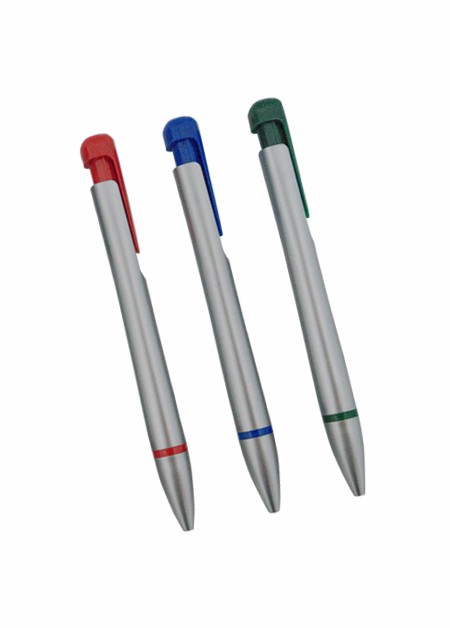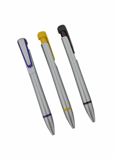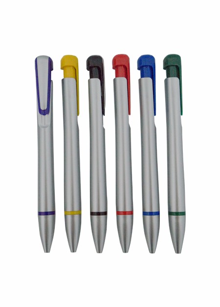 Caneta plástica com escrita: Azul Corpo prata com detalhes coloridos. Tamanho total do produto: (CxC) 14,0cm X 4,0cm Peso total do produto: 9g