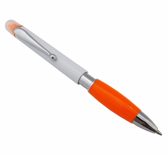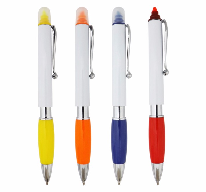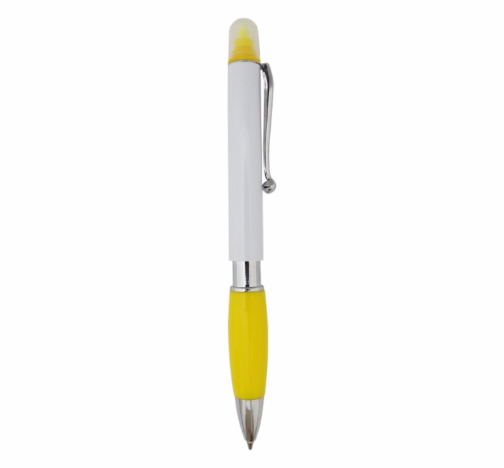 Caneta plástica, com marca texto (cor do marca texto compatível com a cor da caneta).