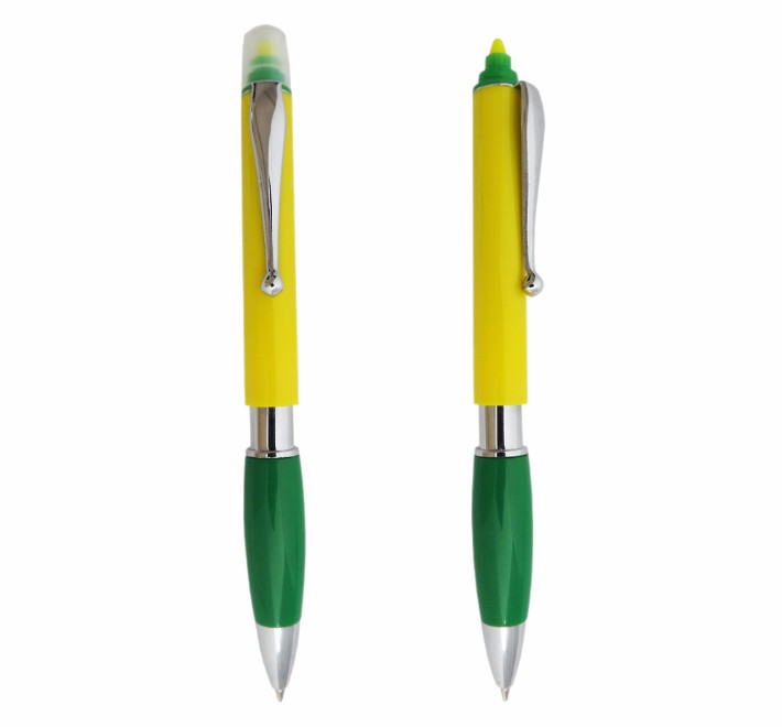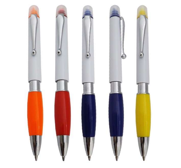 Caneta plástica, com marca texto (cor do marca texto compatível com a cor da caneta). Medidas para gravação (CxC): 6,4 cm x 3,3 cm Tamanho total (CxC): 14,3 cm x 3,08 cm Peso do produto: 11 g