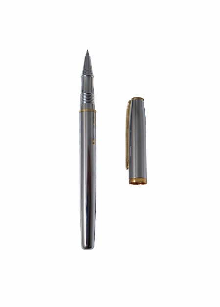 Caneta Roller de metal prata com detalhes dourado. Medidas para gravação (CxD): 7,0 cm x 3,0 cm Tamanho total (CxD): 13,0 cm x 3,5 cm Peso do produto: 24 g