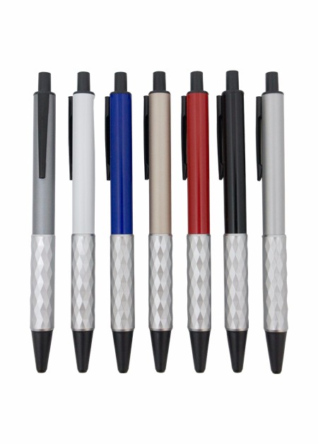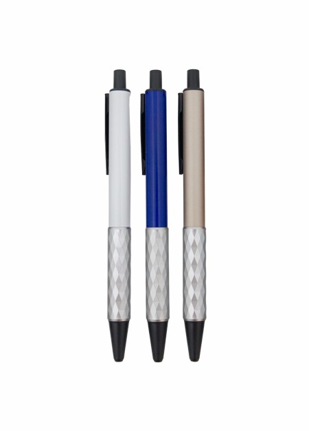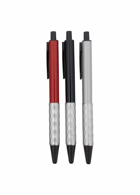 Caneta semi-metal colorida, com empunhadura detalhada. Tamanho total do produto: (CxC) 14,0cm X 4,0cm Peso total do produto: 17g