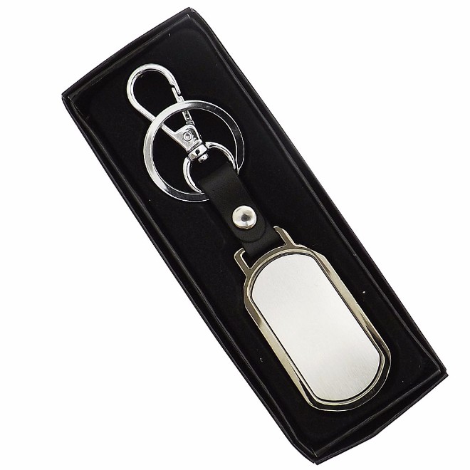 Chaveiro de metal com relevo e detalhe de couro. Embalagem, caixinha preta. Medidas para gravação (CxL): 4,8 cm x 2,3 cm Tamanho total (CxL): 6,1 cm x 3,0 cm Peso do produto: 47 g