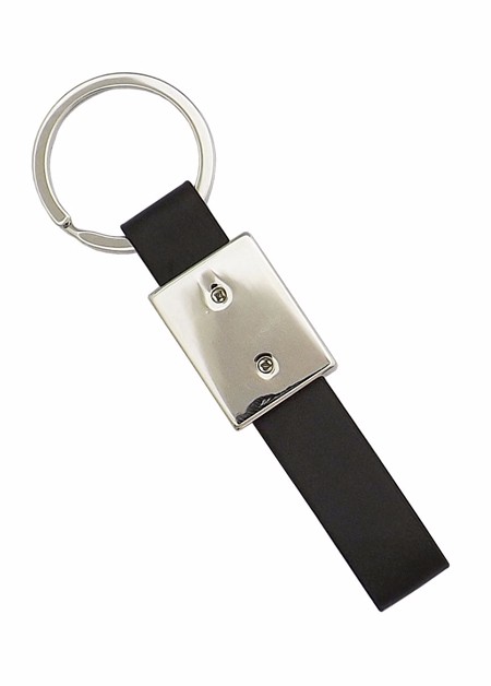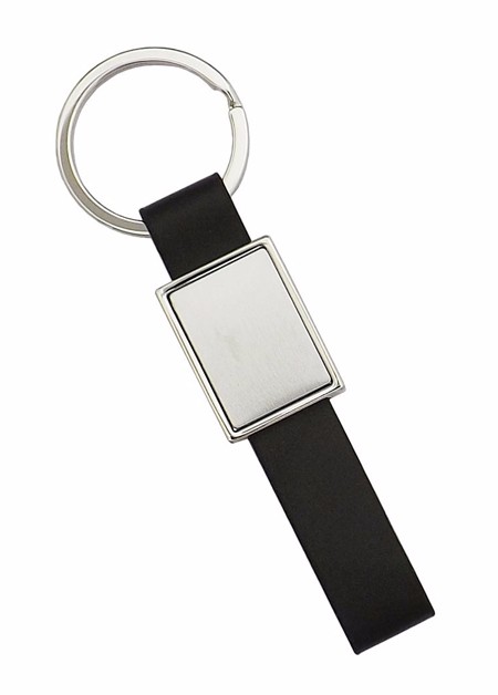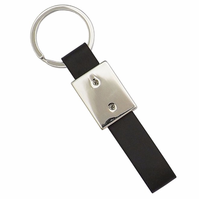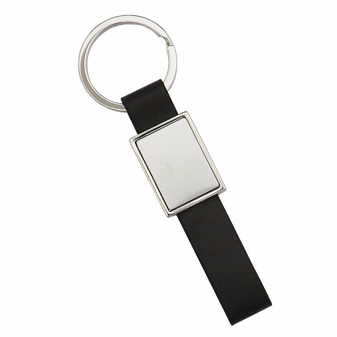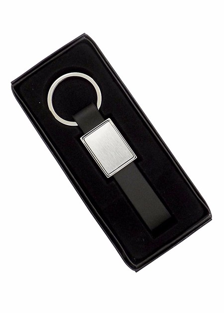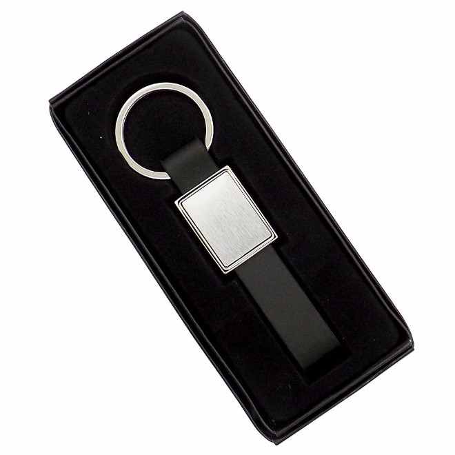 Chaveiro de metal, detalhe de couro sintetico. Embalagem, caixinha preta. Medida para gravação (CxL): 2,0 cm x 2,0 cm Tamanho total (CxL): 8,5 cm x 2,1 cm Peso do produto: 22 g
