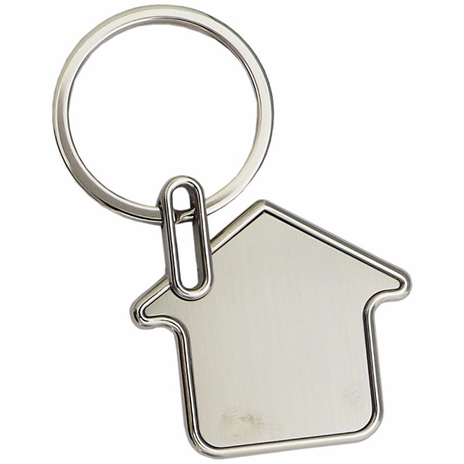 CHAVEIRO DE METAL EM FORMATO DE CASA, NA COR PRATA. Tamanho total (CxL): 4.5 cm x 4.5 cm Medida para gravação (CxL): 3 cm x 3.5 cm Peso do produto: 25 g