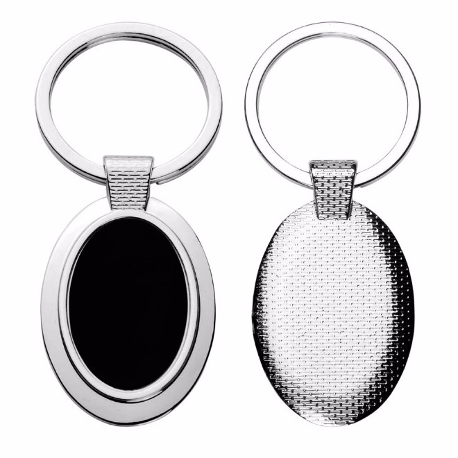 Chaveiro de metal oval, com detalhe preto espelhado. Tamanho total (CxL): 5,7 cm x 3,3 cm Peso do produto: 24 g