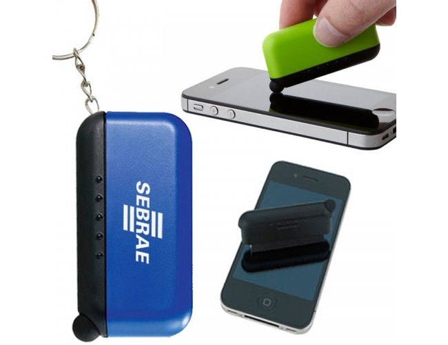 Chaveiro de plástico, com ponta touch e limpador de tela de Smartphone. Medidas para gravação (CxD): 2 cm x 6 cm Tamanho total (CxD): 3,3 cm x 6,3 cm Peso do produto: 12 g