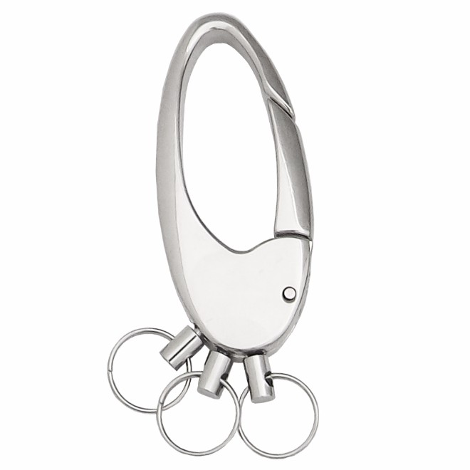Chaveiro mosquetão de metal brilhante, com 3 argolas. Tamanho total (CxL): 8,4 cm x 3,1 cm Peso do produto: 38 g
