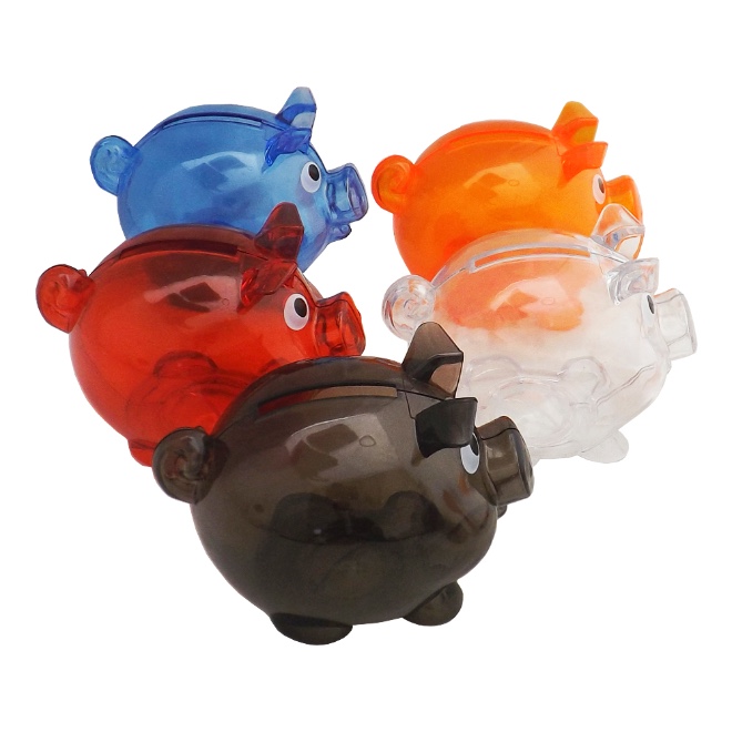 Cofre em formato de porquinho, de acrílico, com abertura em baixo. Medida Total (CxC): 7,0cm X 26,0cm Peso Total: 34 g