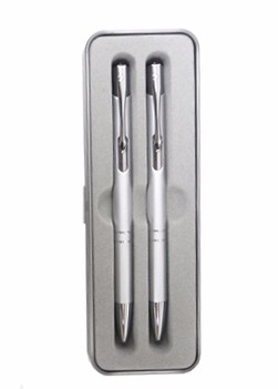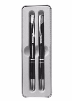 Conjunto com 2 peças e estojo de alumínio. Conteúdo: * Caneta de metal preta * Lapiseira de metal preta Medidas para gravação (CxL): 4,7 cm x 5,8 cm Tamanho total (CxLxA): 6,3 cm x 17,5 cm x 1,5 cm Peso: 86 g