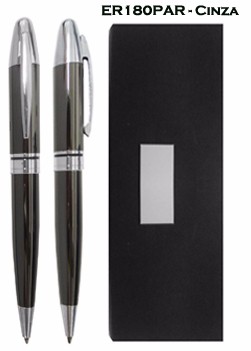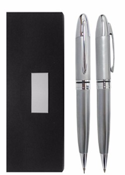 Conjunto de caneta e lapiseira em estojo de papelão resistente. Medidas para gravação(CxL): 4,5 cm x 1,5 cm Medidas da embalegem(CxLxA): 17,5 cm x 6,0 cm x 2,5 cm Peso: 125 g