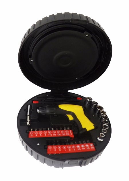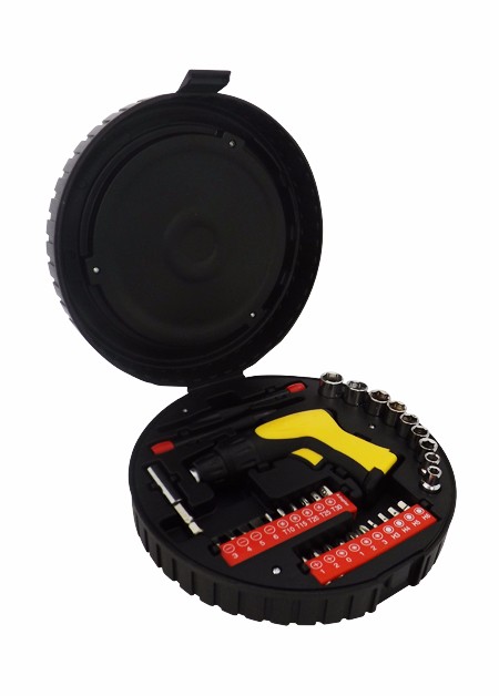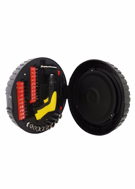 Conjunto de Ferramenta com estojo em formato de roda na Cor PRE/CIN.