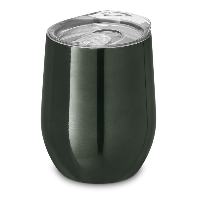Copo de viagem térmico em aço inox com corpo duplo e tampa deslizante. Capacidade até 400 ml. Food grade. Fornecida em caixa. 88 x 112 mm